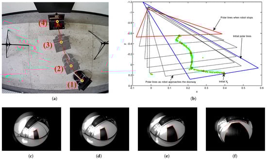 Doorway approaching. (a) Robot trajectory towards doorway. (b) Change in three polar lines and . (c) Doorframe detected at (1). (d) Doorframe detected at (2). (e) Doorframe detected at (3). (f) Doorframe detected at (4).