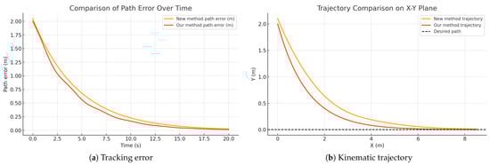 To quantitatively compare the path-tracking performance of the two methods, we implement simulation experiments using a unicycle-type differential-drive model under nonholonomic constraints. The setup is defined as follows: (1) The model state is denoted as , where represent the planar position and denotes the heading angle. (2) The robot is required to follow a straight-line path defined by . (3) The initial state includes both lateral and angular deviations: the robot starts 2 m off the desired path with an initial heading error of . Both methods are assigned the same maximum forward velocity and initialized under identical conditions. We record the lateral deviation (path error) over time and the convergence time required for the model to achieve stable tracking, which serve as metrics to evaluate control accuracy and responsiveness.