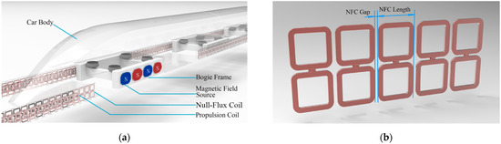 The basic principle of the Null-Flux EDS system is illustrated in Figure 2. NFCs are placed along the guideway, with each set consisting of two oppositely connected coils. The train’s bogie is equipped with magnet field sources, typically superconducting magnets or Halbach permanent magnet arrays.