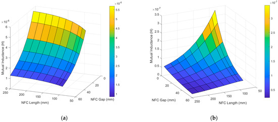 We also calculated the mutual inductance between the NFCs under different NFC lengths and gaps. Due to the positional relationship between the NFCs, the mutual inductance is negative. In the following discussion, the mutual inductance refers to the absolute value of the mutual inductance.