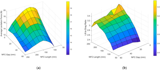 (a) The average levitation force under the different NFC lengths and NFC gaps and (b) the lift-to-drag ratio.