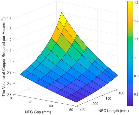 The volume of copper required per meter under the different NFC gaps and NFC lengths. This figure only calculates the impact of the NFC required for a single-sided track.