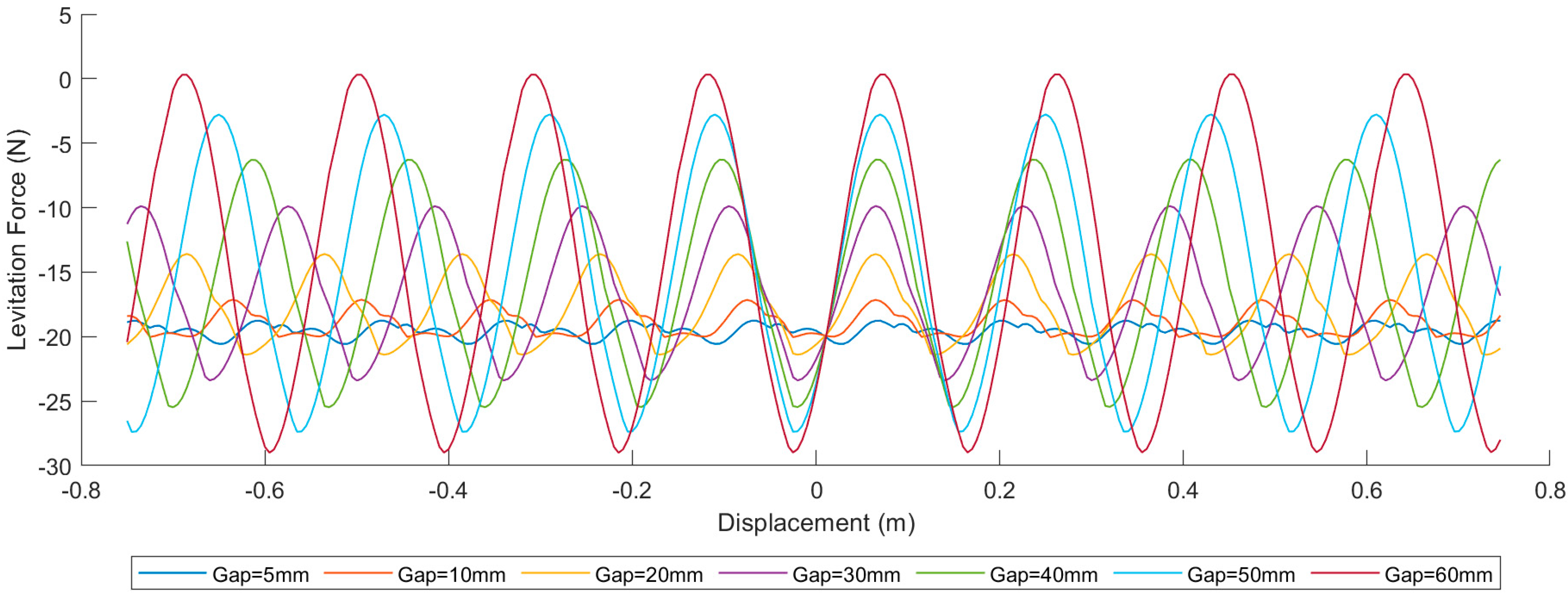 As shown in Figure 6, the levitation force fluctuates in a sinusoidal-like manner, with the wavelength approximately equal to the NFC gap. Meanwhile, as the NFC gap increases, the average levitation force decreases, and the fluctuation of the levitation force becomes more intense. This indicates that the NFC gap has an impact on the variability of the levitation force.