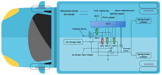 The air circuit system takes the air storage tank as the air source to supply compressed air. The ECU receives signals from the vehicle bus, ignition signals, and so on. It controls the opening and closing states of solenoid valves MV1, MV2, and MV3, as well as the SSV valve, thus accurately regulating the on/off status and flow direction of the air within the air circuit. Meanwhile, the pressure sensor monitors the chamber pressure in the air circuit in real-time and sends feedback to the ECU. The compressed air goes through the control area of the air circuit. When braking, it flows to the spring brake cylinder via the outlet of the air brake valve to implement braking. When the brake is released, the exhaust device expels the compressed air in the air circuit, returning the brake cylinder to its original state.