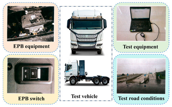 Figure 6. The computer is utilized to collect and analyze vehicle operation data, such as speed, braking pressure, and other parameters. The EPB equipment and switch are the core test objects, which are used to test response speed, braking effect, and other performance indicators and compatibility. The test road conditions include flat roads, ramps, and other types, which can comprehensively evaluate the performance of the braking system in various scenarios and ensure its safety and reliability in practical use. Thus, a real and effective test environment for braking system performance evaluation by integrating vehicles, equipment, braking components, and different road conditions are constructed.