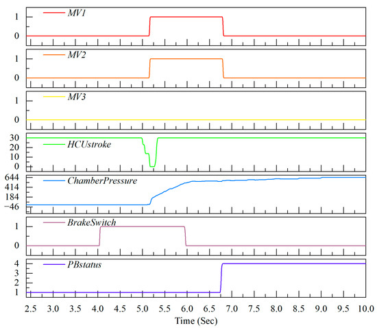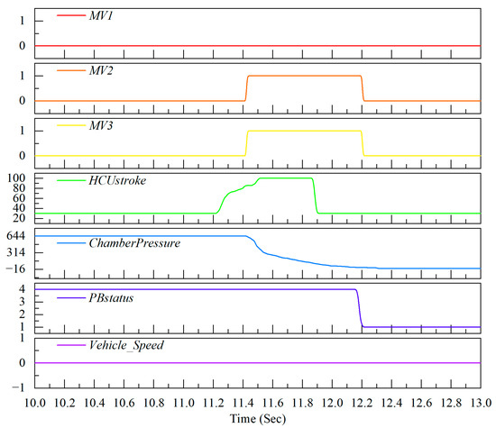Figure 7. During the initial state, the vehicle is at rest and the chamber pressure is 644 kPa. When the EPB switch is pulled up for manual parking operation, the solenoid valves MV2 and MV3 operate, the chamber pressure decreases, the EPB working state changes from release to parking, and the SSV valve is returned.