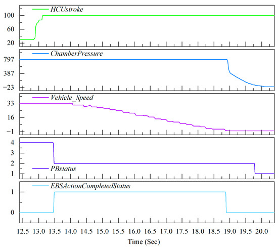 Figure 9. At the start, the chamber pressure was 797 kpa, the vehicle speed was 33 km/h, and the EPB was released. Pulling the EPB switch during driving triggered emergency braking, with the EBS activating simultaneously. The vehicle’s speed dropped to 0, the EBS stopped braking, and the chamber pressure dropped to 0, putting the EPB in the parking state. The average deceleration of emergency braking was about 2.1 m/s