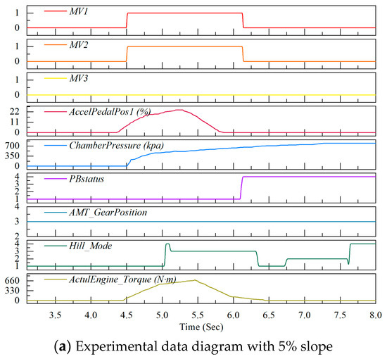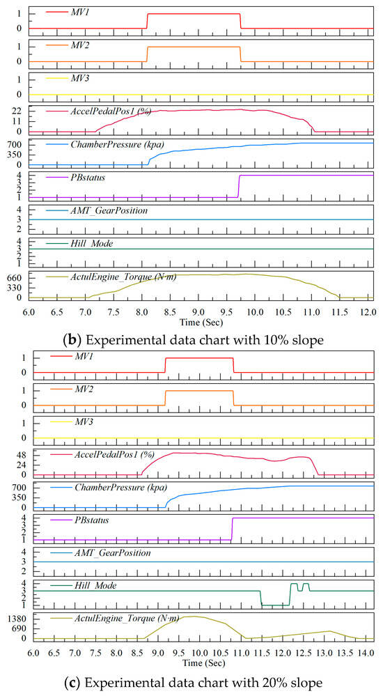 Figure 10. Under the automatic release conditions for starting uphill on three slopes (5%, 10%, and 20%), the initial gear of the vehicle was set to the forward gear AMT Gear Position = 3, the chamber pressure was 0 kpa, the accelerator pedal was not pressed (AccelPedaIPos1 = 0), the EPB was in the parking state, and the actual torque ActuIEngine_Torque was 0. Here, a 5% slope corresponds to a gentle uphill, while 10% and 20% slopes correspond to a steep uphill with Hill Mode = 3.