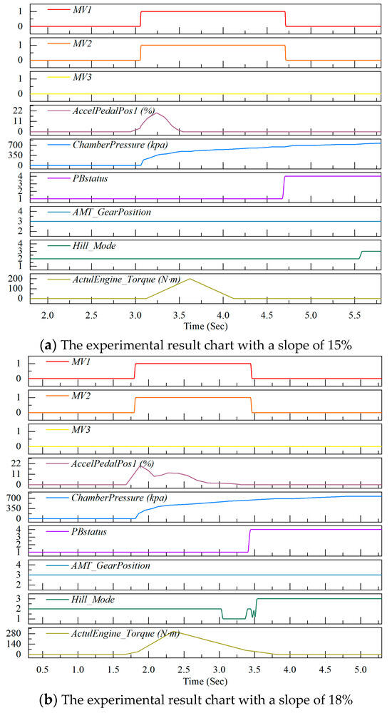 Figure 11. Under the starting conditions on downhill slopes with gradients of 15% and 18%, the initial gear of the vehicle is AMT Gear Position = 3 (forward gear), the chamber pressure is 0 kPa, the accelerator pedal is not depressed (AccelPedalPos1 = 0), the EPB (electronic parking brake) is in the parking state, and the vehicle is in the downhill mode on the ramp. During operation, when the accelerator pedal is gently depressed, the EPB starts to execute the parking release. The solenoid valves MV1 and MV2 operate, the chamber pressure rises, the vehicle starts moving, the working state of the EPB changes to released, and the SSV valve is pressed downward by the chamber pressure.