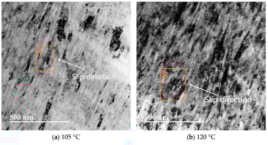 In studying temperature’s impact on dislocation slip and pile-up in springs, temperature selection was crucial. Preliminary tests showed slow degradation at 60 °C. To accelerate degradation, the minimum test temperature was set at 105 °C. High temperatures cause spring creep, altering the degradation mechanism. Since smooth-surfaced spring steel’s creep temperature is 300–350 °C, to avoid rapid elastic-force loss and ensure measurement accuracy, the maximum test temperature was set at 158 °C. Thus, samples heated at 105 °C and 158 °C were chosen to study the temperature-related effects. An accelerated testing protocol was employed to simulate long-term storage conditions. Specifically, specimens Figure 7a,c were subjected to identical heating durations, while specimens Figure 7b,d were heated for extended periods under the same conditions. Samples were extracted from the midsection of the spring wires and analyzed using transmission electron microscopy (TEM). Dense networks of slip lines surrounded the black precipitates labeled A, B, C, and D, propagating in the directions indicated by the arrows. Higher temperatures provide more incredible activation energy for dislocations within the crystal lattice, leading to denser slip-line formations for identical heating durations. During the dislocation-slip process, black precipitates are carried along with the dislocations, resulting in pile-ups when slip lines encounter obstacles. This phenomenon slows the stress-relaxation process until the supplied energy is insufficient to overcome the resistance.