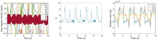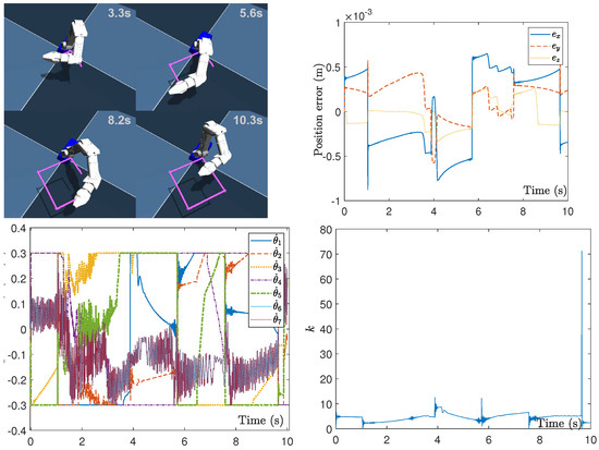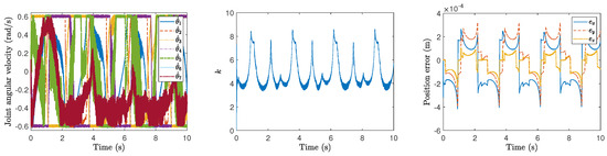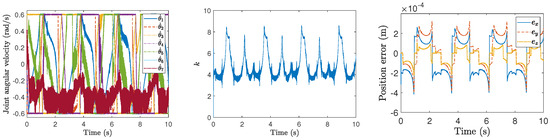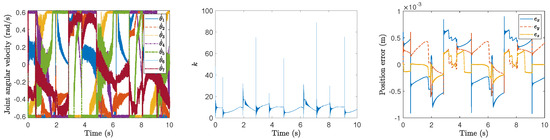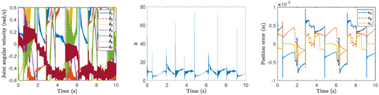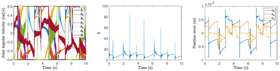 In addition, in Figure 2, it can be observed that the manipulator by the proposed method achieves completion of the square path tracking within 10.5 s, and the second subplot of Figure 2 indicates that the tracking position error of the end-effector is within 10 × 10 4 m. Figure 2 also further presents the kinematic control action at the joint velocity level, and it can be seen that the resolved joint velocity under harmonic noises is always in the boundary [ 0.3 , 0.3 ] rad/s which is satisfying the joint velocity constraint. The time-optimal kinematic control is put to effect by dynamically maximizing the end-effector velocity through modulating the additional factor k, which is shown by the fourth subplot of Figure 2. From the results at a time instant near the end, we can observe that the variable k abruptly increases to keep the time-optimal kinematic control subject to the joint velocity constraints, as k is used as a dynamic gain switch to maximize the end-effector velocity of the manipulator. However, this process sometimes seems not smooth since no trade-off factors are involved to gently modulate the speed of the end-effector for our proposed method. These aforementioned results demonstrate the efficiency and accuracy of the proposed method for time-optimal kinematic control in square path tracking tasks. All of these path-tracking performances for two types of trajectory substantiate the effectiveness and robustness of such a time-optimal kinematic control method.