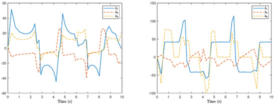Figure 9. Dynamic process of Lagrange multipliers λ of the RNN-based method for time-optimal kinematic control against harmonic noises for different types of noises. (Left) for the circle path tracking; (Right) for the square path tracking.