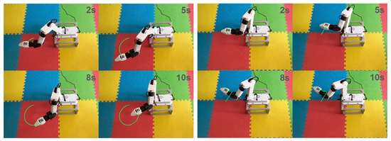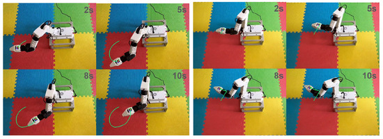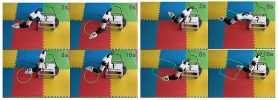Figure 10 shows the motion experimental results of our proposed method for time-optimal kinematic control of the ARM manipulator under harmonic noises. For comparison, Figure 11 and Figure 12 show the motion experimental results of other methods (31) and (32). From these results in these figures, we can observe that, under the same path tracking tasks, the proposed robust time-optimal kinematic control method is able to achieve the tracking completion within the task time 10 s. Nevertheless, the other two methods cannot guarantee path-tracking performance under the same allocated time, and their path tracking completions are getting behind with the proposed method under the same allocated task time 10 s. All of these experimental results demonstrate that our proposed method is superior to other conventional methods on such a time-optimal kinematic control issue against harmonic noises. Moreover, both the simulation and experimental results validate that, for the time-optimal kinematic control problem under harmonic noises, the proposed optimization objective function in workspace can be more efficient than those in joint space.