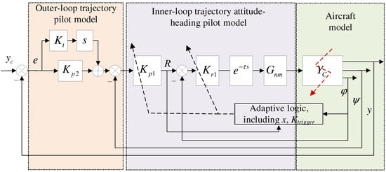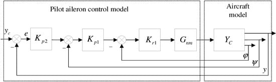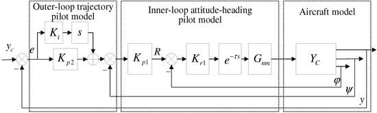 The aileron control model for the pilot under asymmetric thrust conditions consists of an inner-loop attitude-heading control model and an outer-loop trajectory control model. The inner-loop attitude-heading control model is based on the simplified single-loop pilot model proposed by Hess [], and the model structure can be seen in Figure 2 as follows. This model provides a control-theoretic framework with which to study pilot control behavior in instances in which vehicle dynamics changes.