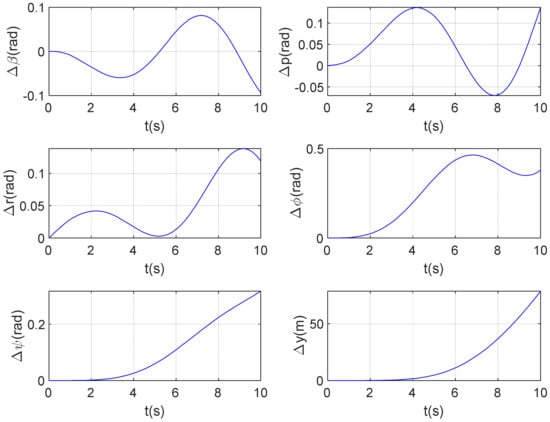 The lateral-directional state response of the aircraft under asymmetric thrust without applying the control is illustrated in Figure 6. From the simulation results, it can be observed that when asymmetric thrust occurs, the aircraft experiences left sideslip due to inertia and the yawing moment, with the sideslip angle being negative. Once the maximum sideslip angle is reached, the aircraft transitions from left sideslip to right sideslip. This is caused by the rolling moment, which tilts the aircraft and alters the direction of lift, causing the flight path direction to change more rapidly than the nose direction. As a result, the aircraft experiences yaw and lateral deviation. Without any control, the aircraft fails to meet performance requirements and enters an uncontrollable divergent state.