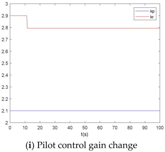 The pilot model is integrated with the asymmetric thrust aircraft model to establish a pilot-aircraft system simulation model. The control of the aircraft is operated by the pilot, and the variation in its gain parameters also reflects nonlinear effects. The aero-engine failure occurs at 10 s, and the resulting flight state is shown in Figure 7a–f. As seen, after the aero-engine failure (at 10 s), the aircraft’s flight states (such as sideslip angle, roll angle, yaw angle, and lateral displacement) change and then stabilize. It is evident that the pilot model is able to maintain the aircraft’s flight stability after the failure occurs. The results of aileron and rudder control inputs are shown in Figure 7g,h. It can be observed that the pilot changes the control strategy after the failure and then stabilizes the control inputs. Figure 7i illustrates the changes in the pilot’s control gains. After the engine failure, the pilot’s inner-loop gain Kr decreases, and through adaptation to the sudden fault, the pilot gradually adjusts the gain to maintain stable control of the aircraft. The pilot’s control behavior characteristics in the lateral-directional imbalance state caused by asymmetric thrust are described.