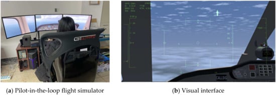 The human-in-the-loop flight simulation experiment involves a pilot-aircraft system consisting of the pilot, the aircraft model, and the pilot-aircraft interface (including the display system and control stick, etc.). This system is a semi-physical simulation, as shown in Figure 8. The control stick is an active side stick equipped with a human sensing system, while the display system shows the current flight scenario and the aircraft’s flight status information. The aircraft model is a mathematical model built in MATLAB/Simulink 2022b, capable of real-time calculations.