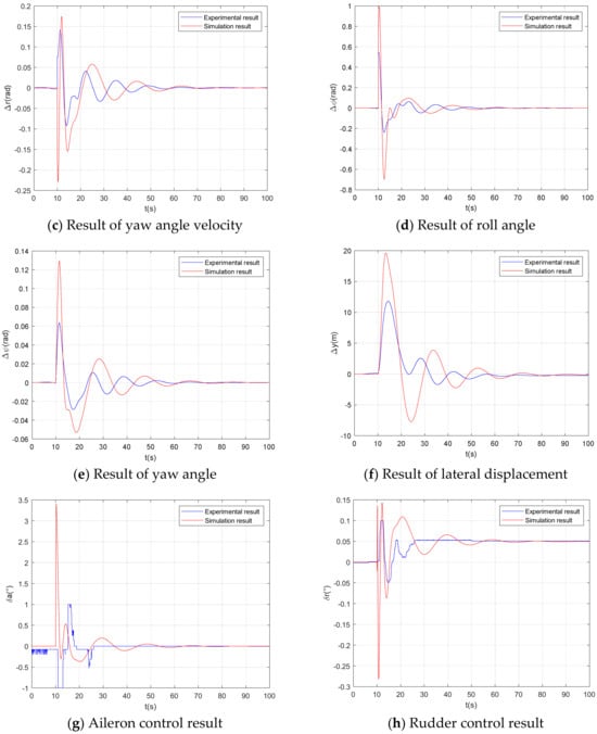 The control results for the ailerons and rudder are shown in Figure 7g,h. It can be seen that the control frequencies in both the simulation and experiment align closely. Due to the limited control force in the experiment, the control fluctuation range in the simulation is slightly larger. Nonetheless, both methods successfully maintain stable flight.