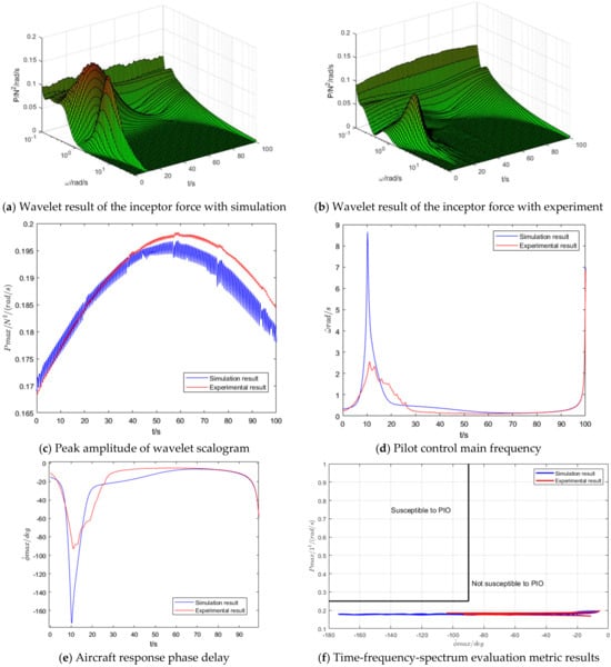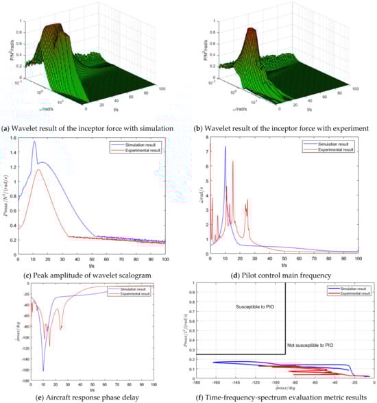 To further validate the established model, an analysis was conducted using the aircraft-pilot couplings evaluation method based on wavelet analysis []. The analysis focused on the time-varying spectral criteria, including the peak force spectrum, the pilot’s main frequency, and the phase delay at the main frequency. The results are as follows.