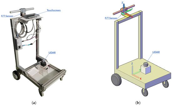 3] further developed a solution on a differential drive platform that includes a human–robot interface tailored for smart walkers. This walker is equipped with a people detection system and enables medical personnel to perform remote operations while simultaneously responding to user movement intentions. In [