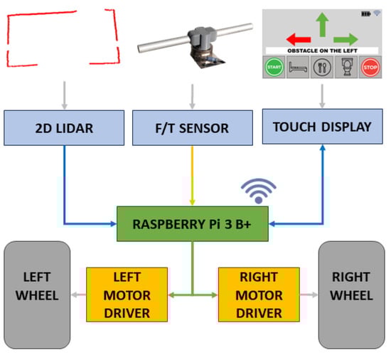 15]. Created to provide a common standard for robots, ROS offers a modular architecture that simplifies the design and development of complex robotic applications. Its flexibility makes it suitable for various robots, from drones to industrial robots. ROS provides a wide range of libraries, tools, and resources to help developers handle tasks such as perception, motion planning, and control. ROS middleware processes all input data, which are then used to execute the walker’s motion. Raspberry Pi communicates directly with the motor drive board through serial communication, allowing it to control both wheels.