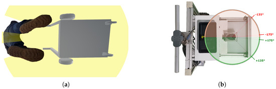 Figure 3b, the heading angle is the angle from the laser scanner to the obstacle. The human body can be divided into two halves along the sagittal plane. Similarly, the sensor data obtained from the LIDAR can also be divided into positive and negative ranges, with 0° representing the back position and 179° representing the front position on either side of the sensor. The platform is specifically designed for indoor applications, thereby mitigating challenges associated with ground variations. In such environments, the primary ground variation encountered is stairs, which the platform is not equipped to traverse. The LIDAR sensor is strategically positioned at a height that facilitates the detection of typical household obstacles, including chairs, tables, plants, walls, and doors. However, lower obstacles were excluded to ensure that the patient’s walking experience remains manageable. The experiments utilized common household objects, such as chairs, tables, and boxes of varying sizes, as obstacles. Although employing real objects would enhance the realism of the scenarios, the use of boxes permitted greater control and reproducibility in the laboratory settings. The LIDAR system is proficient in detecting obstacles of various sizes within designated categories. The redundancy provided by multiple laser acquisitions enhances the system’s ability to perceive objects accurately.