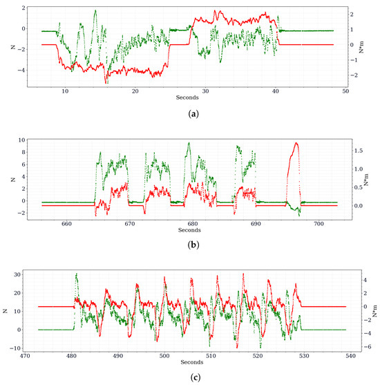 Figure 8c shows the values that the force–torque sensor acquires when the user touches the handlebar fixed on it. The X-axis detects the handlebar’s linear push, corresponding to the pressure of the user who wants to start a forward movement. This is indicated by the green points in