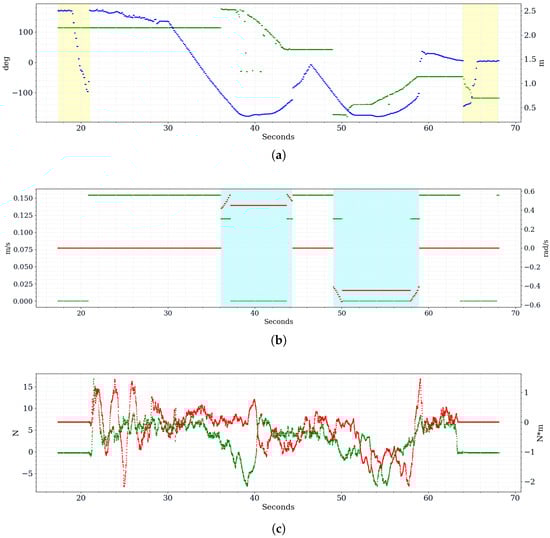 Figure 8b, the computed linear and angular velocities are plotted. The green points represent the linear speed and reach the maximum value of 0.155 m/s without obstacles. The areas highlighted in cyan represent the phases in which the walker activates autonomous obstacle avoidance to help and guide the user in overcoming the obstacle. During the autonomous maneuver, the linear speed is reduced in the initial and final stages, while it is forced to zero in the central part when the platform is rotating in place. Still, in