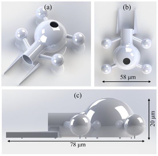 The first version is a modified version from our previously presented study [49]. As shown in Figure 1a, the microbot has four optical handlers. Additionally, a front inlet serves as a channel for loading cargo into the microbot chamber. The inlet is designed with a diameter of 10 m to facilitate the transport of sufficiently large cargo via convective currents. A top hole with a diameter of 7 m is incorporated into the microbot chamber to allow the deposition of a metal layer. A laser beam can be focused on this layer to generate a localized heat source with a high temperature. This heating is expected to induce a convective cycle, creating an inflow toward the microbot chamber. The main dimensions of the microbot are illustrated in the top view in Figure 1b. As shown in Figure 1c, two front spikes are integrated into the design to facilitate interaction with cells. Compared to the previous version, the overall size of the microbot was increased. This scaling up also increased the inlet diameter and metal spot diameter, contributing to stronger convective flows.