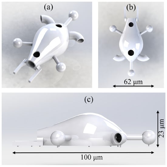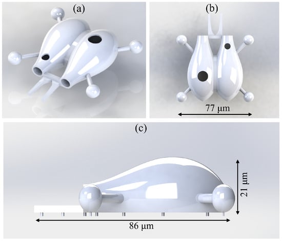 The third design features two chambers for storing cargo, increasing the overall cargo capacity of the microbot. Additionally, this version incorporates two heat sources. The left chamber contains a heat source with a 7 m diameter, while the right chamber has a spot with a 4.5 m diameter. Microparticles will be loaded through the left inlet to the microbot body using the heat source in the left chamber. The second chamber has a heat source positioned closer to the outlet, which will be used for controlled cargo unloading. When the heat source in the right chamber is activated, it should generate an outward flow, directing micro-sized cargo toward the right chamber’s outlet. This configuration allows loading and unloading to be performed independently through separate chambers. Similar to the other two versions, micro-sized end effectors were included in the design for cell interaction studies. The main dimensions of the microbot are shown in Figure 3.