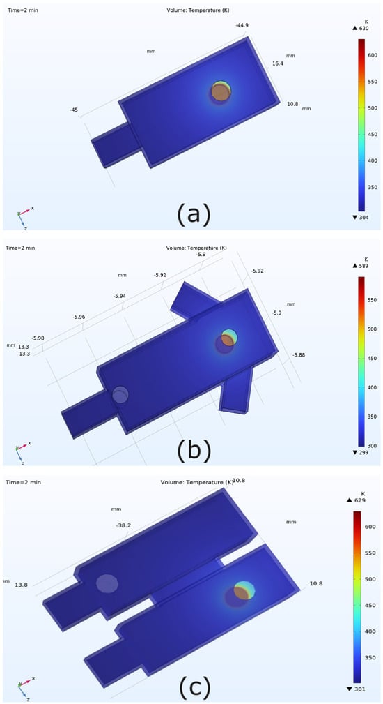 First, a time-dependent study was conducted to analyze temperature variations inside the microbot under a given heat input. The laser power which was applied as a boundary heating to the metal layer was set to 15 mW. In the COMSOL model, the thin gold spot has a thickness of 15 nm. Simulation results indicated that the temperature increased to approximately 600 K within two minutes for all three models. The temperature distribution results for the three simplified designs are shown in Figure 4. The fluid domains are hidden in the figures to show the temperature distribution near the heat source clearly. The highest temperatures were observed in regions closest to the heat source. The results suggest that higher temperatures can be achieved within a short time period when the thin layer of gold is heated at a power input of 15 mW.