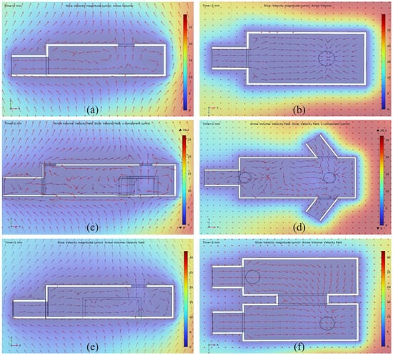 Flow velocity distribution during loading: (a) version 1 side view, (b) version 1 top view, (c) version 2 side view, (d) version 2 top view, (e) version 3 side view, and (f) version 3 top view.