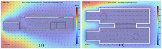 Flow velocity distribution during unloading: (a) design version 2 side view and (b) design version 3 top view.