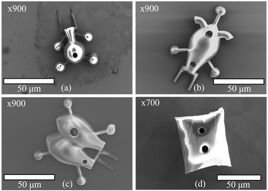SEM images: (a) version 1 microbot at a 900× magnification, (b) version 2 microbot at a 900× magnification, (c) version 3 microbot at a 900× magnification, (d) masked microbot at a 700× magnification.