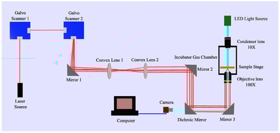 The experimental setup used in this study is a modular optical tweezer system. The OTKB system from Thor Labs has been modified to include useful functionalities to our requirements. The laser source produces near-infrared region light with a wavelength of 976 nm. The maximum attainable power output at the fiber output is 300 mW. As shown in Figure 8, the laser beam first goes through two Galvo scanners. They are used to create multiple optical traps, which are essential to manipulate microbots. After the Galvo scanners, multiple mirrors and convex lenses are utilized to create a collimated beam to fill the back focal of the 100× objective. It has a numerical aperture of 1.25, which helps to create stronger traps by focusing the laser beam to the sample, resulting in a higher gradient force. In order to illuminate the sample, an LED light source is used. A dichroic mirror allows only the LED light to pass toward the CCD camera in the system. Microbot samples can be placed on the movable 3-Axis NanoMax stage. The position of the sample can be shifted with an on-axis accuracy of 1 m/s using stepper motors. Using the camera feed, visual feedback of the microbot can be received. A stage-top incubator (OKOLAB, Pozzuoli, Italy) was integrated with the optical tweezer system to carry out studies with biological samples. It maintained the cells at ambient conditions maintained at 37 °C in a humidified atmosphere containing 5% CO2.