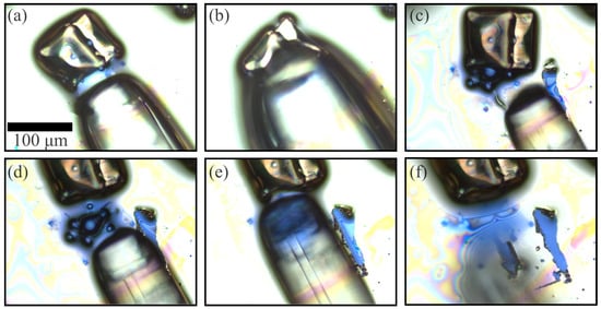 Stepwise extraction process of a version 2 microbot. (a) The syringe tip is moved to the same level as the microbot sample. (b) Using the syringe the mask is slowly pushed away. (c) Parts of the microbot are released from the mask. (d) With a few more attempts, the mask is completely removed from the microbot. (e) Microbot is collected by pulling the syringe plunger back. (f) Substrate after collection process.
