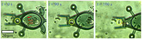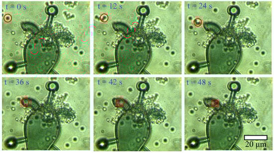 Increasing the power output further intensified the convective flows, resulting in rapid motion of the silica beads. Fast flow generation under 34 mW power output is shown in the Supplementary Video S8. At this power output, tracing of a particle loading through a microbot inlet with a velocity value of about 45 m/s is shown in the Figure 12. The reported value is much faster than previously reported silica bead velocities under laser-induced loading [31]. By giving a laser-guided disturbance to a microbot loaded with particles, it has been confirmed that the loaded particles remained in the microbot chamber (Supplementary Video S9).