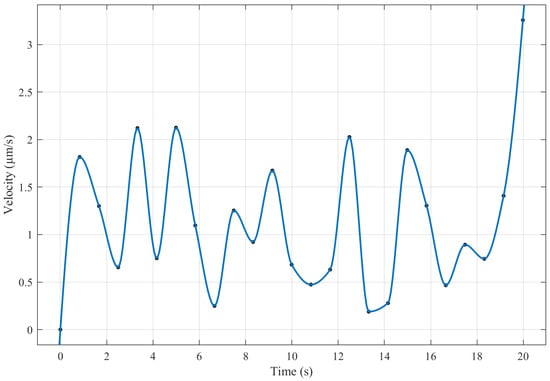 To generate convective flows, the microbot’s heat sources were precisely targeted using the laser beam. The experiments were carried out using microbot design version 2. Silica beads with a 2 m diameter served as the cargo. No significant movement of the silica beads in the fluid was observed until the laser power output reached 21 mW, as shown in the Supplementary Video S6 at low power outputs. The laser output was measured closer to the front lens of the 100× objective. A laser power meter (PM100D, THORLABS, Newton, New Jersey, United States) with a photodiode sensor that can measure beams with a wavelength range of 400–1100 nm was used. At a 21 mW output under 105 mA input current, the silica beads in the surrounding area began moving toward the microbot’s inlets. Figure 10 illustrates the trajectory of a silica bead, highlighted by a red circle, as it moved toward the microbot’s inlet. This motion is shown in Supplementary Video S7. For this motion, trajectory data were extracted using the Python (Version 3.13.0) library Trackpy, which uses a set of image processing algorithms [50]. Using position data, for a 20 s period, the silica bead velocity variation was analyzed and is shown in Figure 11. The velocity values were in the range of 0.5–2 m/s until the beads got closer to the microbot inlet. Near the inlet, the velocity increased to over 3 m/s.