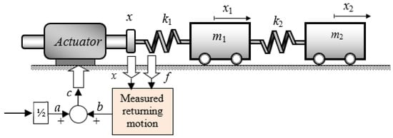 To illustrate the adaptation of the traveling wave concept, consider a representative example: a vertically oriented rectilinear mass–spring system controlled by a single actuator, as shown in Figure 2.