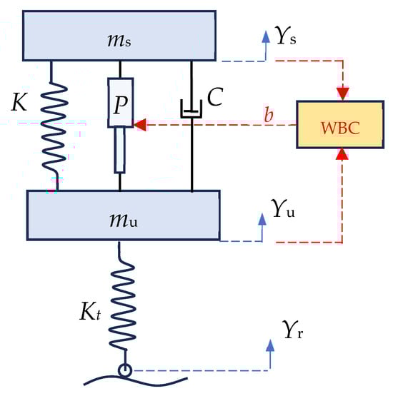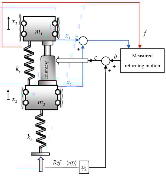In suspension systems, the primary objective is to control vibration rather than a combination of vibration and position, aiming to minimize the vertical acceleration of the sprung mass (m1). Consequently, the first term in Equation (2), 0.5r(t), is omitted. This simplifies the control input to c(t) = b(t), which is ultimately designed to pull m1 toward m2 in response to an upward road input, as illustrated in Figure 2. Furthermore, since the ideal behavior is for the net displacement of the sprung mass (x1) to remain at zero (x1 = 0), it was inferred that the returning wave b(t), defined by Equation (3), can be further simplified. The coefficient 0.5 and the term 0.5 are removed, resulting in a more streamlined expression for b(t). This adaptation has been incorporated into the development of the WBC-assisted quarter-car model, which is detailed in the next section.