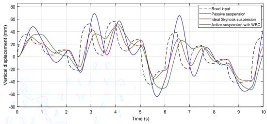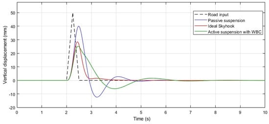 The first test involved a pulse input with an amplitude of 0.05 m, lasting 0.5 s, and occurring at t = 2 s. The system’s response, in terms of the vertical displacement of the sprung mass (mu), is shown in Figure 5. While the rise time to reach approximately half of the input’s magnitude is similar across all three suspension models, the WBC-assisted model exhibits a lower overshoot during the initial bounce. This overshoot typically represents the maximum vertical displacement experienced by the sprung mass. The reduced overshoot in the WBC model demonstrates its superior performance in effectively managing the initial road shock in the vertical direction.