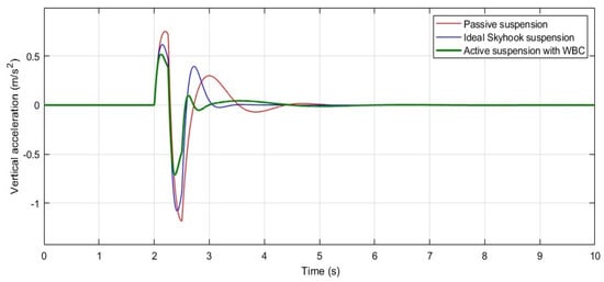 Another observation from the pulse response is that the suspension model equipped with the ideal skyhook damper exhibits a relatively better settling time compared to the system using WBC. However, the key criterion for ride comfort is the vertical acceleration experienced by the passenger (sprung mass), which was measured during the pulse input and is shown in Figure 6. As depicted in this graph, the passive suspension model results in the largest initial overshoot and the longest settling time, as expected. In contrast, the skyhook model immediately reduces the initial peak after the pulse input; however, it experiences a significant second peak in the vertical acceleration of the sprung mass approximately one second later. On the other hand, the active suspension model with WBC achieves the lowest acceleration amplitudes during both the first and second overshoots, even without the use of additional damping or extensive sensors, which highlights the effectiveness of WBC in minimizing vertical acceleration and improving ride comfort.