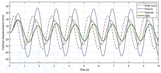 As the second test, the developed suspension model was operated under an uneven, periodically varying road surface. Figure 7 illustrates the performance of the WBC in tracking the suspension system’s displacement under sinusoidal road input conditions, which simulate the wavy profile of a typical road surface. The sinusoidal signal, used as the road input, induces vertical movement of the vehicle mass at a frequency of 5 rad/s (0.796 Hz) with an amplitude of 50 mm.