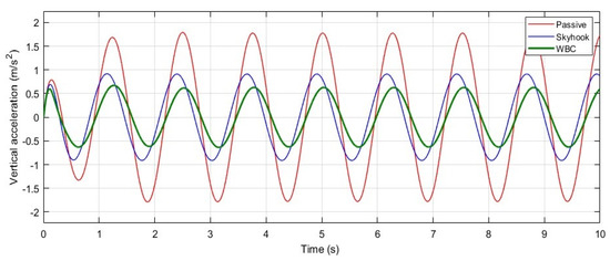 System response: vertical acceleration of sprung mass () under sinusoidal road excitation, which shows the vertical acceleration of the sprung mass, comparing passive, ideal skyhook, and WBC-assisted active suspension systems.