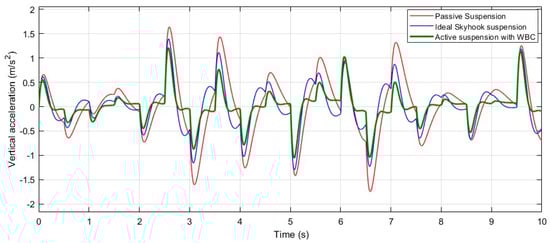 As shown in Figure 8, the WBC achieves an average oscillatory acceleration peak of approximately 0.65 m/s2. In comparison, the skyhook and passive suspension models exhibit higher values of around 0.9 m/s2 and 1.75 m/s2, respectively. This indicates that the WBC-assisted active suspension improves ride comfort by approximately 63% compared to the passive suspension model and by 28% compared to the skyhook model.