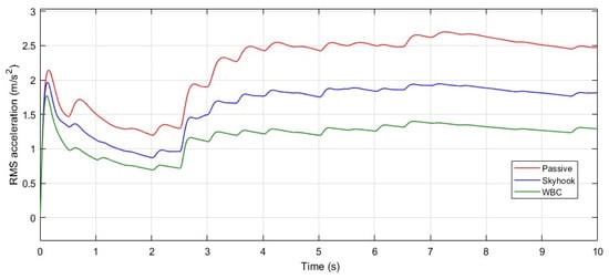 At the end of the runtime, the RMS values of sprung mass acceleration were approximately 2.5 m/s2 for the passive system, 1.8 m/s2 for the skyhook system, and 1.3 m/s2 for the WBC system. These results indicate that the WBC provides significantly improved ride comfort, with reductions of approximately 48% and 28% compared to the passive and skyhook systems, respectively.