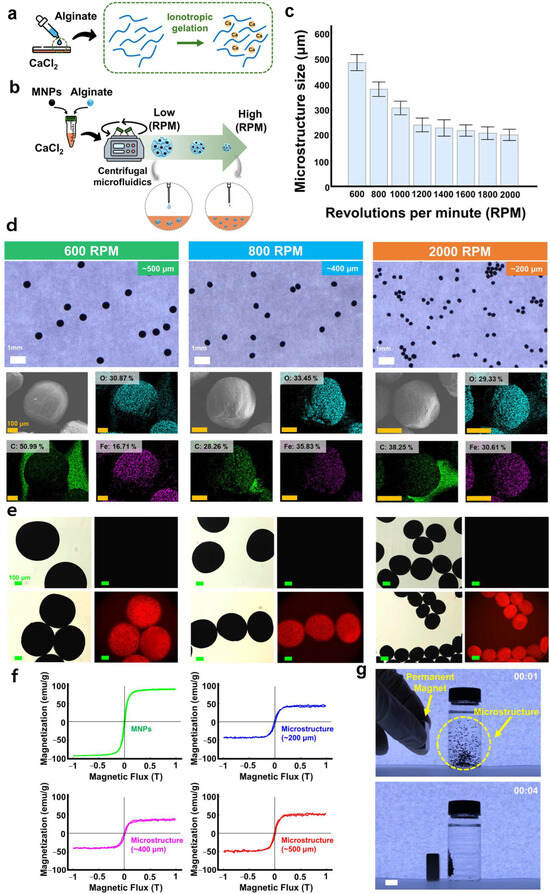 Preparation and characterization of the magnetically actuated microstructure. (a) Schematic illustration of the hydrogel formation when alginate reacts with calcium chloride. (b) Schematic illustration of the preparation of the microstructure. (c) Size distribution of the microstructures according to revolutions per minute (RPM). (d) Optical and SEM-EDS images of microstructures. (e) Fluorescence images without (top) and with (bottom) DOX loading. Microstructures (~500 μm, ~400 μm, and ~200 μm). (f) Magnetization curves of the microstructures with different sizes (~500 µm, ~400 µm, and ~200 µm) and MNPs. (g) Magnetic response of the magnetically actuated microstructures using a permanent magnet. Scale bar, 10 mm. In all figures, the time is indicated on each figure in the minutes/seconds format.