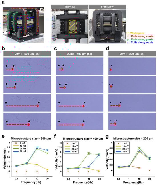 Magnetic mobility of the magnetically actuated microstructure. (a) Experimental setup of an EMA system for generating an external magnetic field to evaluate the mobility of the microstructures. (b–d) Images and (e–g) graphs showing the velocity of the magnetically actuated microstructures with different sizes (~200 µm, ~400 µm, and ~500 µm) in five seconds according to the rotating magnetic field strengths (1, 10, 20, and 30 mT) and rotation frequencies (0.5, 1, 10, and 20 Hz). (b) ~500 µm, (c) ~400 µm, and (d) ~200 µm sized microstructures at 20 mT. ‘×’ markers indicate conditions under which the microstructures exhibited no observable movement (velocity = 0 mm/s).
