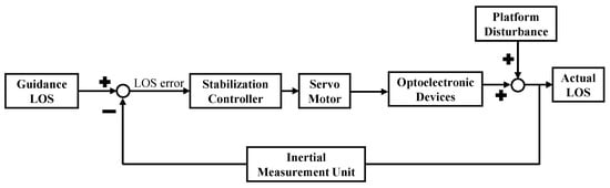 Electro-optical imaging and tracking devices, such as gimbals and reflective steering mirrors, can be mounted on motion platforms (aircraft, vehicles, ships, etc.) for beam control and target acquisition, aiming, and tracking [1,2,3,4]. Compared with traditional static platforms, electro-optical imaging tracking systems mounted on motion platforms are susceptible to platform-induced disturbances, resulting in LOS jitter, degraded beam pointing accuracy, and reduced target tracking accuracy [5]. LOS stabilization methods for electro-optical imaging and tracking systems on motion platforms can be categorized into direct and indirect stabilization [6]. Direct LOS stabilization involves mounting the IMU directly on the LOS axis of the system (e.g., the pitch axis of a gimbal). The IMU detects the LOS deviation and feeds it back into the system to form a closed-loop control, compensating for LOS motion and achieving stabilization. The principle of direct stabilization is illustrated in Figure 1.