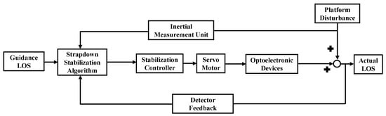 Indirect LOS stabilization, also known as strapdown stabilization, involves mounting the IMU on the motion platform to measure the platform’s attitude variations in inertial space. The LOS deviation is determined by integrating the platform’s attitude variations with the positional information of the electro-optical system. This information is then fed back into the system within a closed-loop control framework to compensate for LOS motion. The principle of strapdown stabilization is illustrated in Figure 2.